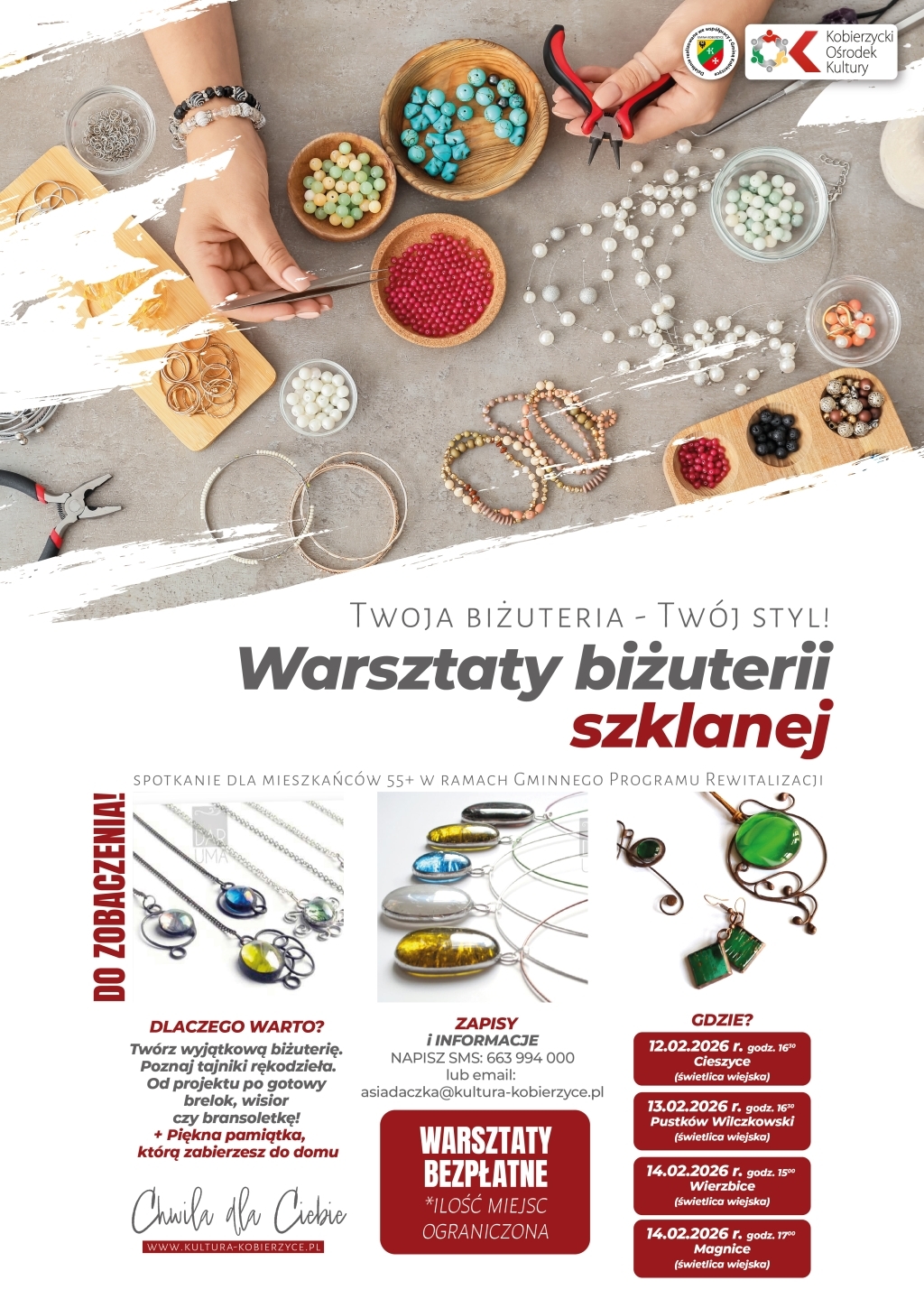 Zapraszamy na warsztaty kreatywne, podczas których stworzysz niepowtarzalną biżuterię ze szkła – dokładnie taką, jaka pasuje do Ciebie. To spotkanie zaplanowane jest dla mieszkańców 55+, organizowane w ramach Gminnego Programu Rewitalizacji, ale zapraszamy każdego, kto chce spróbować czegoś nowego i twórczego.